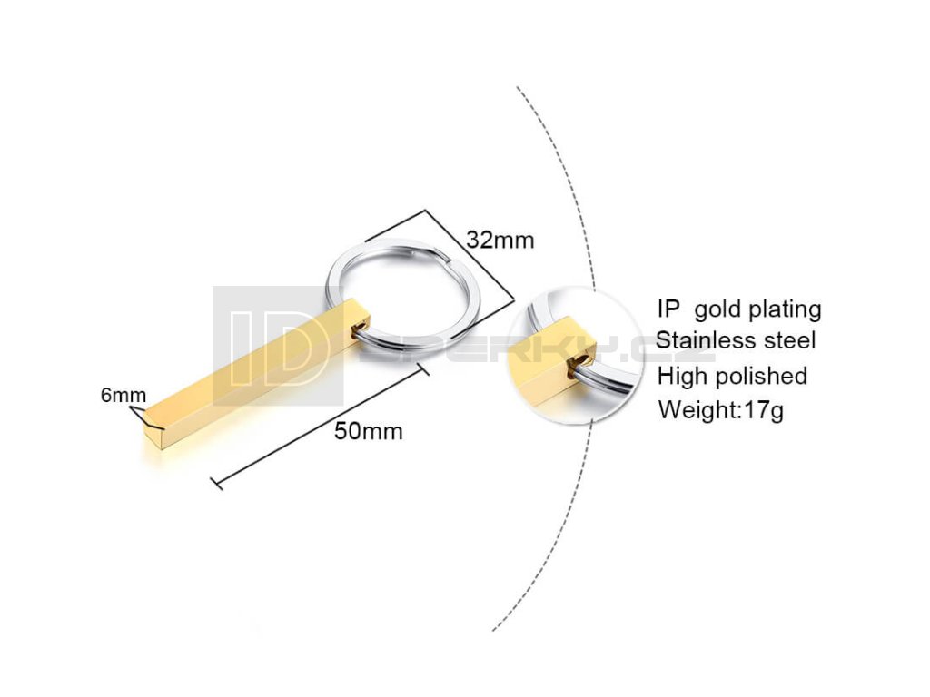 Ocelová klíčenka z chirurgické antialergické oceli 316L. Vhodná na gravírovaní drobného textu, loga. Rozměr destičky 6x50mm, průměr kroužku 32mm.