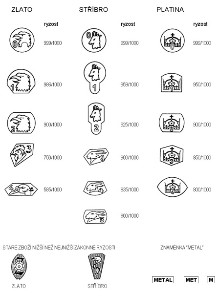 Příloha č. 3 - V současnosti užívané české puncovní značky pro zlaté, stříbrné a platinové zboží