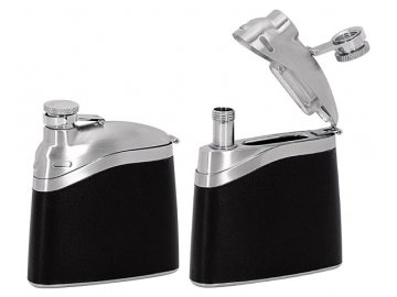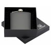 Černá matovaná nerezová ocel. Lakováno speciálním lakem s pogumovaným efektem. Protiskluzová povrchová úprava. Obsah 175ml. Rozměr 93x115x23mm. Součástí balení dárková krabička se sametem.