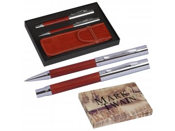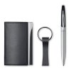 Elegantní set s kuličkovým perem s černou náplní, vizitkářem a klíčenkou. Materiál kov/PU kůže. V černém dárkovém boxu. Cena s gravírováním je za celou sadu.
