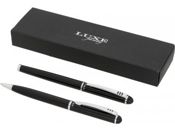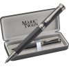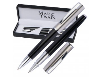 Kovové kuličkové pero Mark Twain s tmavým pochromovaným saténovým povrchem a modrou náplní. Dodává se v dárkovém boxu. Cena s gravírováním je za celou sadu.