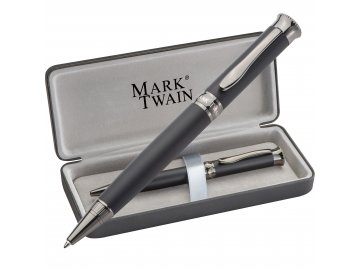 Kovové kuličkové pero Mark Twain v matné černé s kovovými axcenty a prémiovou náplní Parker. Dodává se v dárkovém boxu.