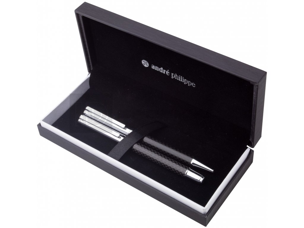 Elegantní sada kovového kuličkového pera a rolleru s karbonovým vzorem a lesklými chromovanými díly. V černé dárkové krabičce, s modrou náplní. Značkový produkt André Philippe. Cena s gravírováním je za celou sadu.
